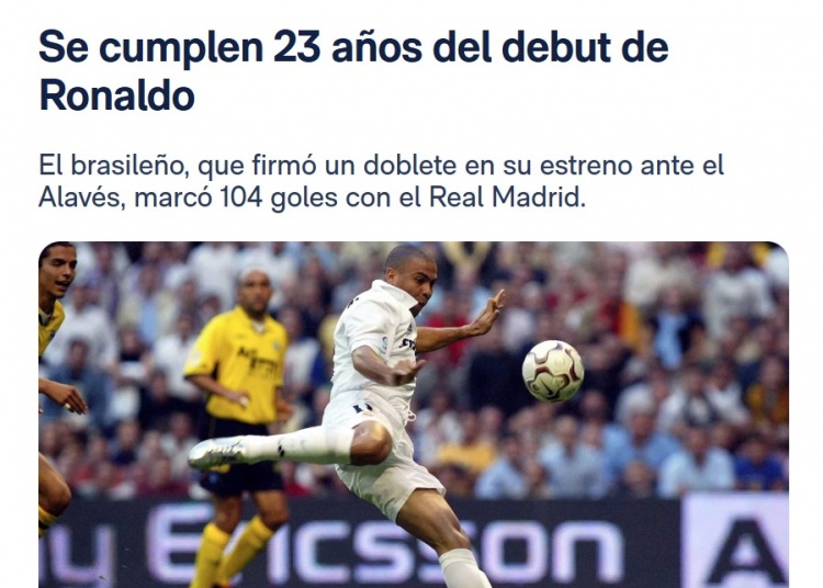 2002年10月6日,在伯纳乌对阵阿拉维斯的比赛中,罗纳尔多替补登场仅一分钟便取得进球,并最终以梅开二度的表现开启了他的皇马生涯。